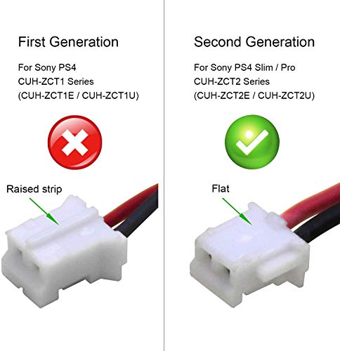 - [Qué enchufe] - los controladores inalámbricos PlayStation 4 vienen con las mismas baterías LIP1522, sin embargo, los conectores son diferentes: ✅grande PH2.0 o ❌pequeño ZH1.5. Este enchufe grande se adapta a PS4 DualShock 4 fabricado en 2015 o antes sin barra de luz dentro del panel táctil: CUH-ZCT1E, CUH-ZCT1H, CUH-ZCT1H / B, CUH-ZCT1H / R o CUH-ZCT1U. Elija un enchufe pequeño para la serie CUH-ZCT2 con barra de luz. Le sugerimos que revise el enchufe antes de ordenar