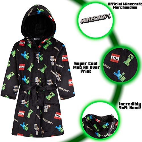 Minecraft Bata para Niños con Diseño Creeper, Batas de Estar por Casa de Forro Polar Suave con Capucha, Ropa de Dormir para Niño, Regalos Originales para Gamers Niños (7-8 años, Negro)