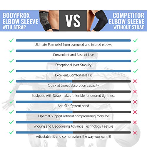 - Codera con sistema antideslizante para una sujeción óptima: la codera Bodyprox con correa está cuidadosamente diseñada con un vendaje altamente elástico que te permite mover libremente tus brazos y se mantiene en su lugar. No se desliza ni se enrolla, asegurando que no interfiera en tu estilo de vida activo