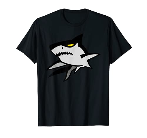 - Diseño fresco de un tiburón de ojos amarillos salvaje loco amenazador multicolor con dientes afilados.