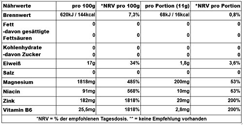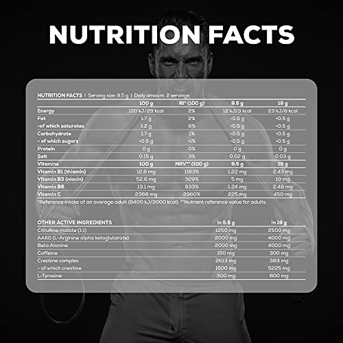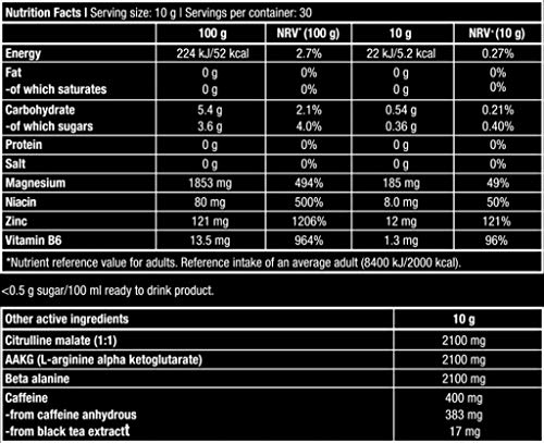 - Dosis (5 gramos): 3150 mg Complejo NOX - 1050 mg L-arginina AKG, 1050 mg L-citrulina malato, 1050 mg Beta-alanina, 200 mg Black Caffeine Matrix - 191.5 mg cafeína anhídrida, 8.5 mg cafeína de extracto de té negro, Complejo ZMB - 96 mg magnesio, 6 mg zinc, 0.8 mg vitamina B6, 4 mg niacina