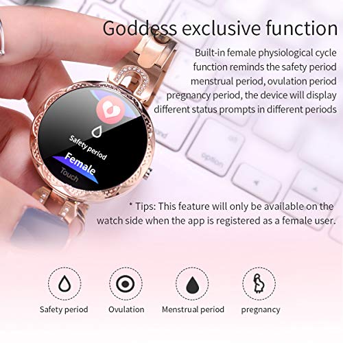 - [Recordatorio fisiológica]: SmartWatch KW10, Ronda pantalla táctil IP68 a prueba de agua reloj para las mujeres, perseguidor de la aptitud con la frecuencia cardíaca y dormir pulsera podómetro para iOS / Android puede predecir y recordar cuando su período fisiológico comienza a registrar los ciclos individuales y calcularcuando se acerca la ovulación, lo que le da una experiencia fácil.