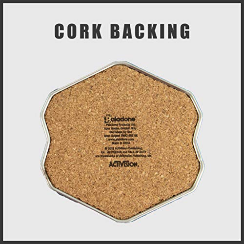 - Producto oficial: juego de 4 posavasos de metal con base de corcho y diseño impreso. Capacidad para una taza de tamaño estándar. Inspirado en los juegos de éxito, el juego de posavasos Call of Duty es un producto con licencia oficial