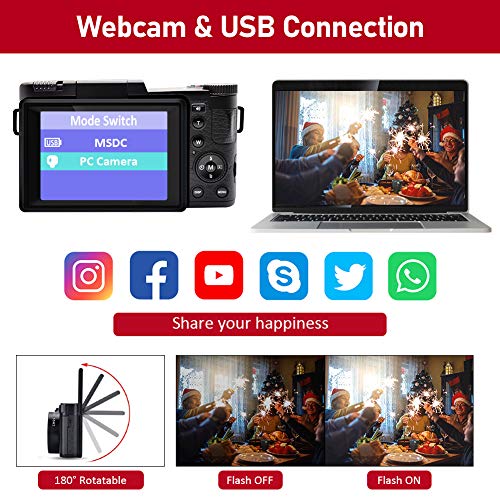 - 【Vlogging & Webcam】 esta cámara digital soporta el modo de vídeo. Se puede utilizar como cámara web y es fácil de usar. Se puede utilizar para hacer videollamadas con familiares y amigos y también para transmitir en vivo. También puedes guardar las imágenes almacenadas por la cámara en tu ordenador o cargarlas en YouTube para compartir tus momentos hermosos.