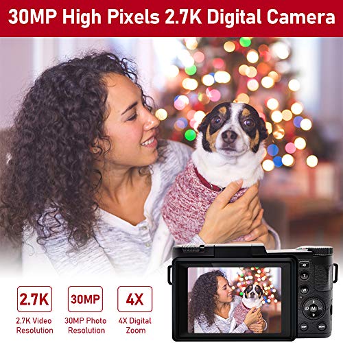 - Cámara digital con pantalla abatible. Esta cámara compacta está equipada con una pantalla ultra alta de 3 pulgadas y puede girarse 180 grados para satisfacer las diferentes necesidades de la fotografía. La cámara fotográfica digital graba fotos y vídeos vivos con una resolución de 30 MP y una grabación de vídeo de 2,7 K. Con el zoom digital de 4 aumentos, podrás capturar los detalles más finos en tus fotos y vídeos.