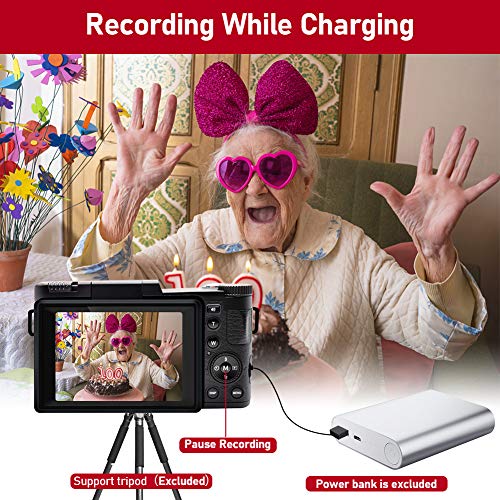- Grabación durante el proceso de carga de la cámara digital soporta la grabación durante el proceso de carga, por lo que puedes grabar cualquier vídeo que quieras sin preocuparte de que se agote la batería. La cámara Vlog viene con 2 pilas recargables y se puede cargar directamente a través del cable USB (incluido). La cámara soporta la función de pausa. Pulsa el botón "Pausa" para continuar la grabación en el mismo archivo sin reiniciarlo.