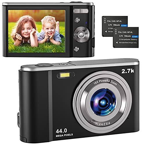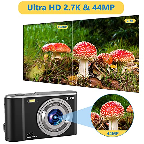 Compactas Cámaras Digitales, 2.7K UHD Camara Compacta, Vlogging 44MP Camara de Video, Camara de Fotos con Pantalla de 2,8" y Zoom 16x y 2 baterías, Camara Digital para niños/Adultos/Mayores (Black)