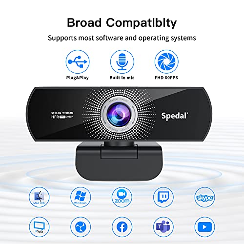 Spedal Webcam 1080p 60fps Full HD Cámara Web con Micrófono para Escritorio Webcam Portátil para PC Webcam USB para Video Chat y Grabación Compatible con Windows Mac Plug and Play