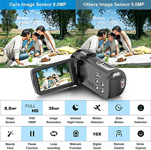 - 【Videocámara videocámara】 La cámara de video es Full HD 1080P con una resolución de imagen de 36.0 MP, una pantalla IPS ultra clara con una rotación de 270 ° y una cámara con zoom digital de 16x. También tiene un sensor de imagen CMOS de 8 megapíxeles que le permite capturar imágenes y videos vívidos y extremadamente realistas.