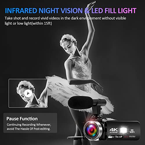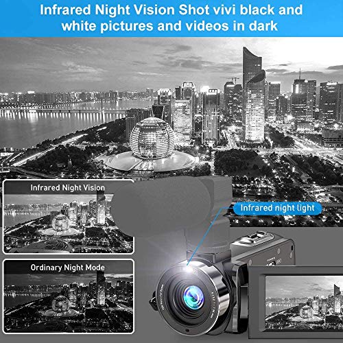 - ★ Videocámara 4K WiFi con visión nocturna: ¿A alguien le gusta lidiar con cables y problemas de conexión? Nadie hace. Transfiera sus videos de forma inalámbrica, sin el laberinto de cables. Esta cámara 4K WIFI ofrece imágenes claras a 48 MP y video nítido a 30 FPS. También tiene una visión nocturna increíble, por lo que grabar videos por la noche sigue siendo agradable y claro. Disfrute de las increíbles capacidades de captura de imágenes y la visión nocturna de la videocámara.