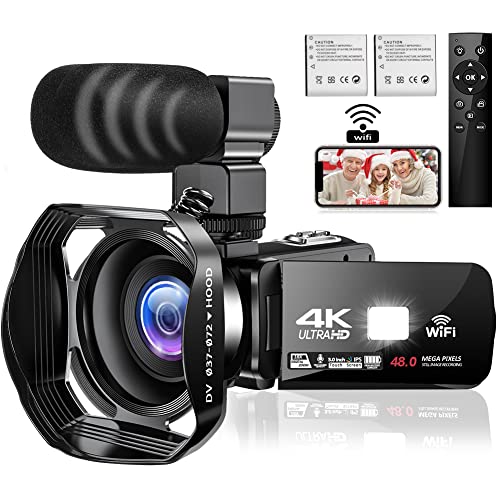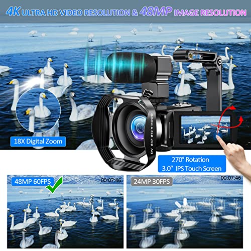 Videocámara 4K Cámara de Video 48MP 60FPS WiFi Videocamara 18X Zoom Digital con IR Versión Nocturna Vlogging Cámara 3.0"IPS Pantalla táctil con micrófono, Parasol, Control Remoto inalámbrico 360°