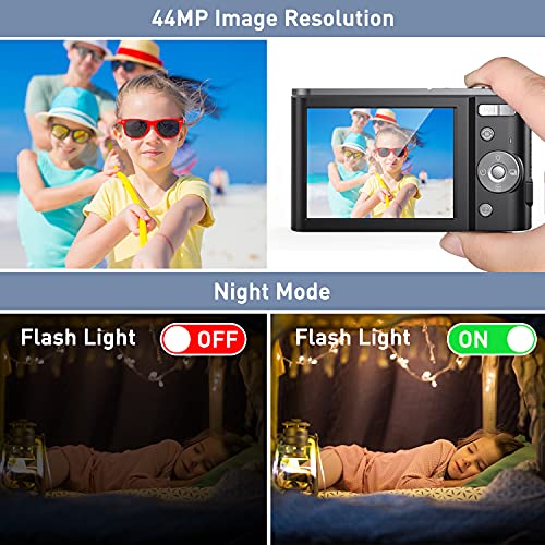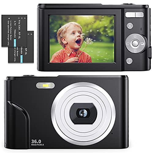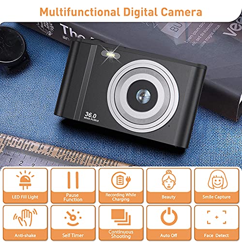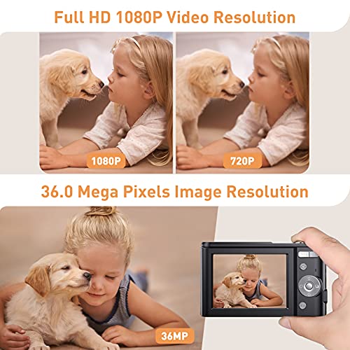 - 【Cámara digital HD 1080P y 36MP】Esta cámara digital con resolución de vídeo HD 1080P y resolución de imagen de 36 MP puede lograr excelentes efectos de grabación y crear tu obra maestra de alta definición. Flash incorporado, para que no te pierdas y capturar cada hermoso momento.