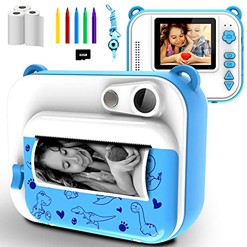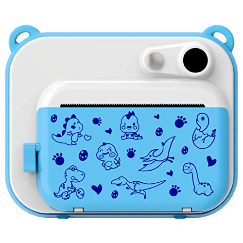 Uleway Cámara de Fotos para Niños Cámara Instantánea Infantil Regalo de Cumpleaños para 3-12 Años Videocámara Digital con Tarjeta SD de 32GB/ Papel de Impresión/Bolígrafo de Colores (Azul Dinosaurio)