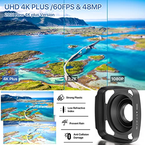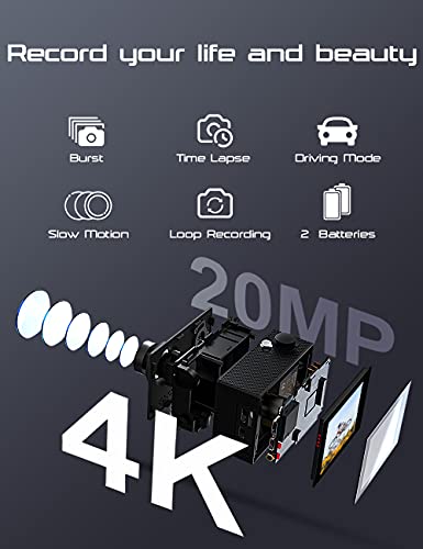 - ?【4K 20MP e Impermeable 40M】 Esta cámara deportiva se actualiza a 20MP, y tiene 4K / 30fps, 2.7K / 30fpS, 1080P / 60fps, para que usted pueda capturar el momento maravilloso. La carcasa está hecha de materiales mejorados y duraderos y tiene una clasificación de resistencia al agua aumentada de 30M a 40M. Disfrute del paisaje en un mundo submarino más profundo.