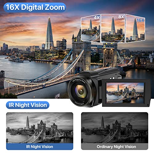 - 【Cámara de video 4K y 48MP】: Esta cámara de video está equipada con el sensor de imagen CMOS actualizado más reciente, que puede brindar una imagen nítida con un zoom digital de hasta 16x de 48MP y video 4K nítido y fluido. También puede establecer la resolución en 1080P 60FPS para una mayor velocidad de fotogramas.