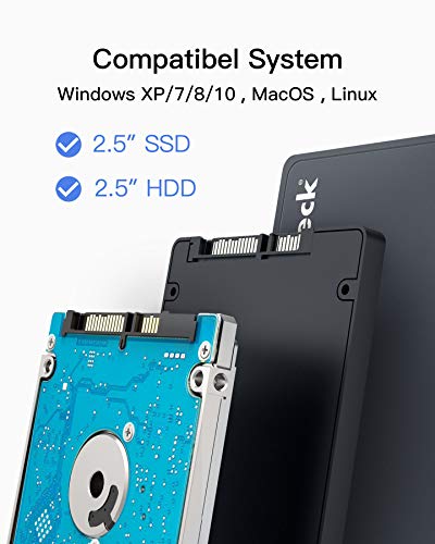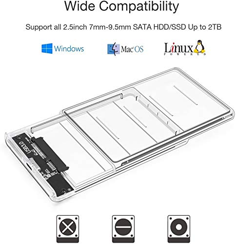 - Amplia compatibilidad, admite sistemas Windows, LINUX, Mac OS 9.0 y superiores, Chrome OS, consolas de juegos como PS4, PS4 Pro, PS3, Xbox one, Xbox 360; Raspberry Pi; TELEVISOR; Enrutador, etc. Diseñado para HDD y SSD SATA de 2,5 pulgadas y 7 mm / 9,5 mm de hasta 10 TB. Compatible con WD, Seagate, Toshiba, Hitachi, Samsung, Crucial, SSD y HDD con puerto SATA, etc.