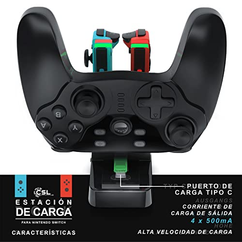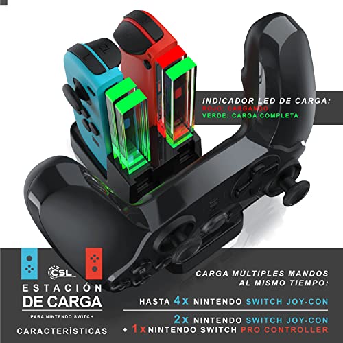 CSL - Estación de Carga de mandos Compatible con Nintendo Switch Joy con - para 4 mandos o 2 y un Mando Pro Controller - LED de Estado - Negro