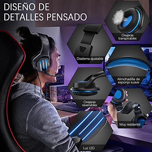 - ?【Diseño Pensado】 El diseño de estos auriculares para juegos es muy pensado y el peso ligero de 269 gramos no afectará su columna cervical. Las almohadillas de espuma suave de las orejeras son transpirables y cómodas, y la diadema ajustable permite que los auriculares se ajusten a su cabeza, por lo que no se cansará incluso si los usa durante mucho tiempo.