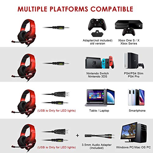 - 【Compatibilidad Multiplataforma】 Los Pacrate auriculares funcionan con PS4, PS5, PS4 Pro / Slim, Xbox One, controlador Xbox One X, PSP, PC, computadora portátil, computadora, tableta, teléfono móvil y la mayoría de los demás dispositivos con conector de audio de 3,5 mm . NOTA: Xbox One S requiere un adaptador adicional (NO INCLUIDO) para ser compatible. La interfaz USB se utiliza SOLAMENTE para luces LED.