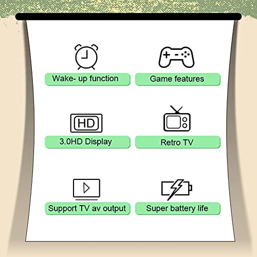 - Puede configurar arbitrariamente el brillo,el contraste,el croma y VCOM en la interfaz del juego..Puede configurar el idioma y ajustar el tiempo de suspensión de forma gratuita en el modo de reloj.Salida de TV:puede usar el cable de salida AV para conectar esta consola de juegos al televisor y mostrar la pantalla del juego en tiempo real en la pantalla del televisor para que puedes disfrutar del juego en la pantalla grande.
