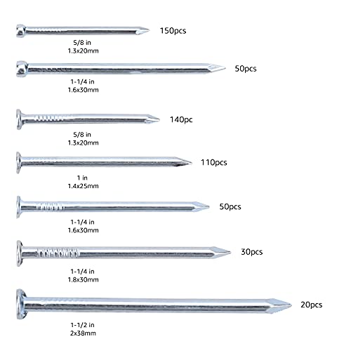 - 7 longitudes y estilos diferentes, entre los que se incluyen clavos de acabado, de alambre, normales, brad y para colgar cuadros