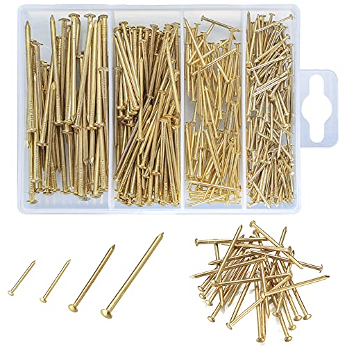 - Cuatro tamaños: este producto contiene cuatro tamaños, incluyendo 50 clavos de latón dorado de 5 cm, 100 clavos chapados en latón de 3,8 cm, 100 pines de pared de latón de 2,5 cm, 100 pines de panel de 1,9 cm.
