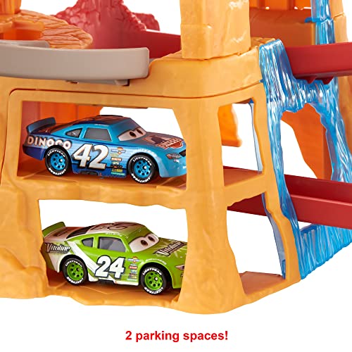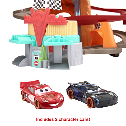 Cars Radiador Springs Pista de carreras de coches de juguete, incluye 2 vehículos personaje, regalo para niños +3 años (Mattel GTK90)