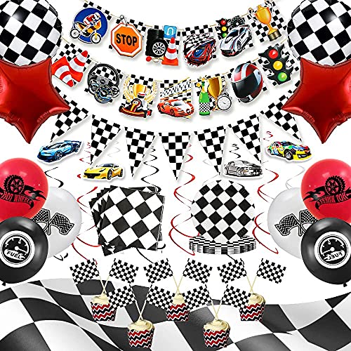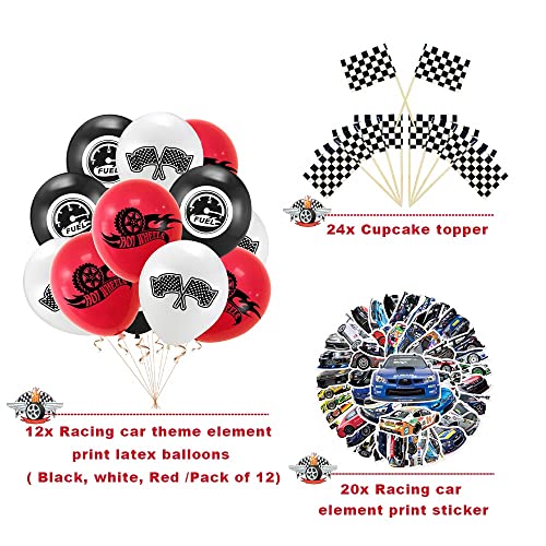- ►【Vamos a la fiesta de coches de carreras! Una fiesta de carreras genial para los niños comienzan tus motores y corres a nuestra fiesta para celebrar. Esto es lo que preparamos: 1 funda de mesa, 1 banderín a cuadros (10 unidades), 2 globos de aluminio de color blanco y negro, 2 globos de estrella de aluminio, 6 decoraciones colgantes, 12 globos de látex con diseño de coche de carreras (negro, blanco, rojo), 13 elementos decorativos para colgar elementos de coche de carreras, 20 npakin, 20 placas, 20 pegatinas de impresión de coche de coche de carreras.