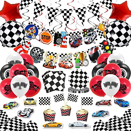 Juego de 97 piezas de suministros de fiesta de cumpleaños para coche de carreras y rallye para decoración de fiesta de cumpleaños para niño incluido Banner Globos de mesa, tazas de servilletas