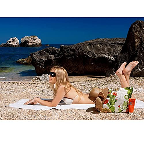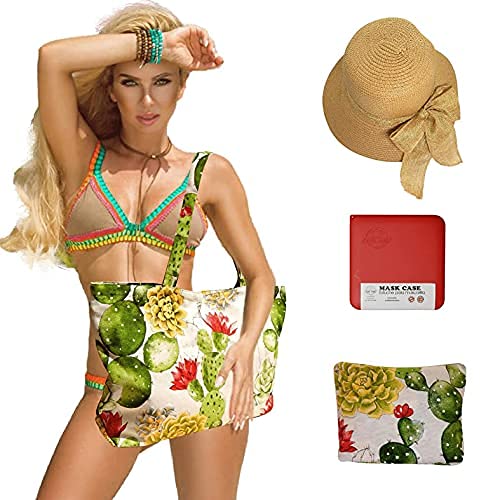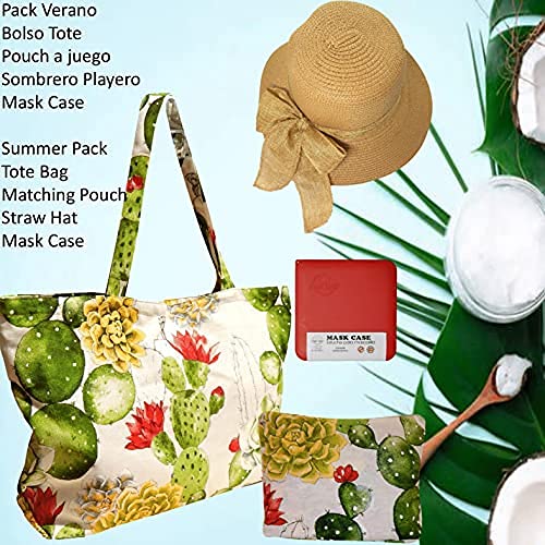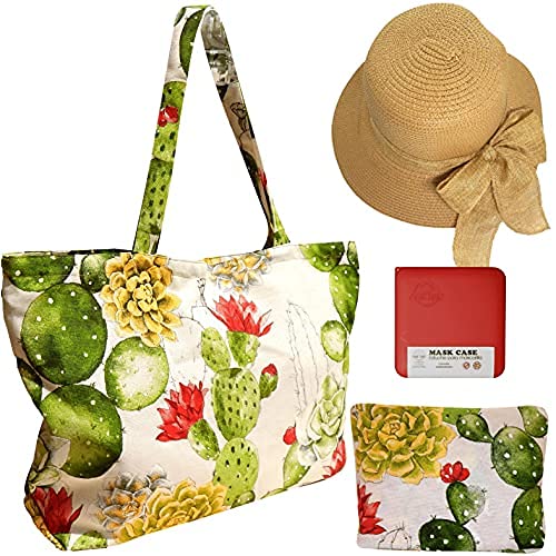 Cussi - Bolsa de Playa y Compra Grande XXL. Tote Bag de Tela Estampada + 1 Pouch a juego y 1 Sombrero de Playa (Cactus)