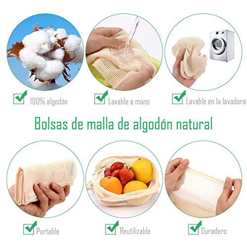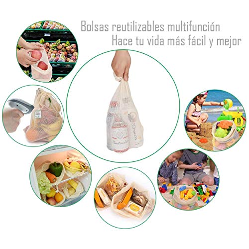 - Juego de 3 Bolsas de Compra Reutilizables, Malla 100% Algodón Orgánico Biodegradable, totalmente Ecológica y no Tóxica e Inofensiva. Puede estar en contacto directo con frutas y verduras.