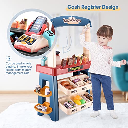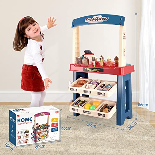 TOPQSC Juego de supermercado 55 Piezas Juego Tienda simulación Conjunto supermercado para niños con luz / Sonido / escáner de Trabajo / Carrito de Compras y Accesorios Regalo de cumpleaños