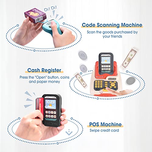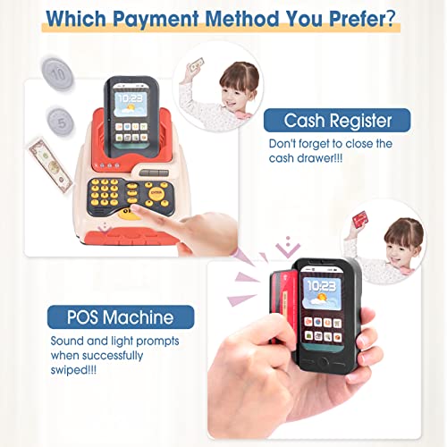- ? [Mostrador de caja] El juego de juguetes del supermercado también proporciona un mostrador de caja, presiónelo suavemente, el cajón de efectivo puede salir, también puede deslizar la tarjeta para pagar, habrá un aviso de luz y sonido cuando la tarjeta se deslice correctamente.