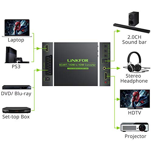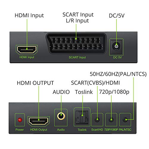 Convertidor Scart a HDMI 1080P Adapdator SCART + HDMI a HDMI Compatible con RGB (50 / 60Hz) y CVBS (NTSC/PAL) con Entrada 3.5mm y Audio Coaxial 2.0CH para HDTV STB PS3 Sky BLU-Ray DVD