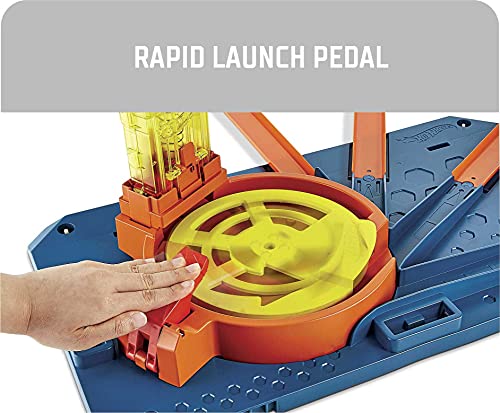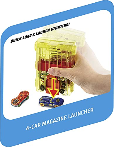 Hot Wheels Caja de pistas con lanzador Set de juego para construir pistas de juguete, con 30 piezas, incluye 1 vehículo die-cast (Mattel GVG11)