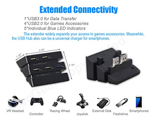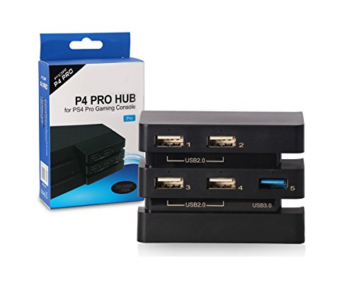 - [Hub USB PS4 Pro] - 1x USB3.0 y 4x USB2.0 salidas agregan más puertos en la consola PlayStation 4 Pro. La interfaz USB3.0 es para dispositivos de almacenamiento de datos: unidad de disco duro externa o unidad flash. 4 interfaces USB 2.0 compatibles con controladores DualShock 4, auriculares PS VR, auriculares, teclado y volantes