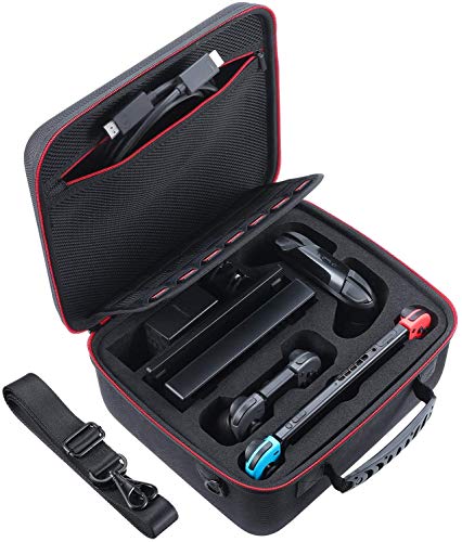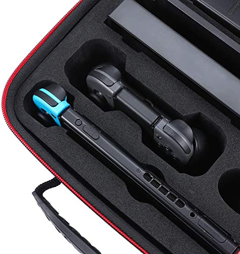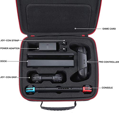 - Diseño personalizado para adaptarse al sistema completo de Nintendo Switch (consola de conmutación, base, adaptador de corriente, agarre joy-con incluso con joy-con, correas joy-con y cable HDMI adicionales) y controlador Switch Pro adicional, admite 21 tarjetas de juego y otros pequeños accesorios.