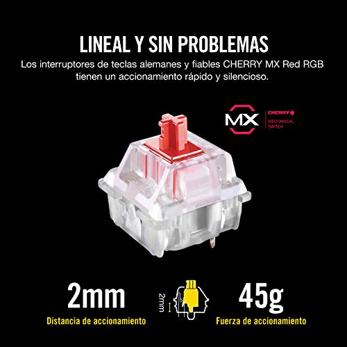 - 100% CHERRY MX RGB Red Mechanical KeySwitchs: ofrecen un viaje lineal, combinado con una mínima fuerza de resorte, lo que resulta en una suave pulsación de teclas para un juego de rendimiento