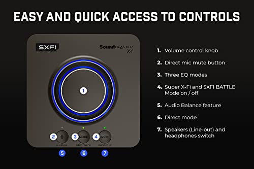 - FÁCIL ACCESO A TODOS LOS CONTROLES: Elija entre tres modos de ecualización o vuelva a programarlos. También están los botones de encendido / apagado de los modos Direct Mic Mute, Direct Mode, Super X-Fi y SXFI BATTLE MODE, así como un botón para cambiar entre altavoz (salida de línea) y auriculares. Después de hacer una configuración, ajuste instantáneamente los niveles de volumen entre dos fuentes de audio (SPDIF / Óptico / USB) con la función Audio Balance a través de la rueda de volumen