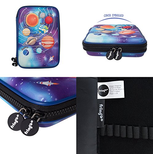 FRINGOO® Estuche grande para niños con tapa dura en relieve, varios compartimentos, doble cremallera, diseño divertido y organizador de papelería (sistema solar, tapa dura)