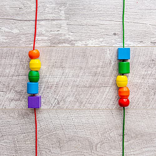 - 30 cuentas de madera de colores vivos y 5 formas distintas, más 2 cordones extra-largas para muchas actividades
