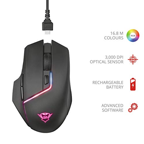 Trust GXT 161 Disan - Ratón inalámbrico gaming RGB con batería recargable y sofware avanzado, color negro