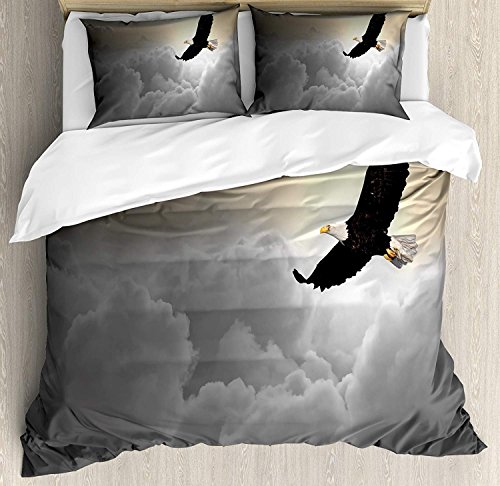 Conjuntos de ropa de cama Eagle Quilt, Majestic Creature Flying above Clouds Liberty Democracy and Freedom, Juego de funda nórdica de 3 piezas para niños / niños / adolescentes / adultos, gris pálido