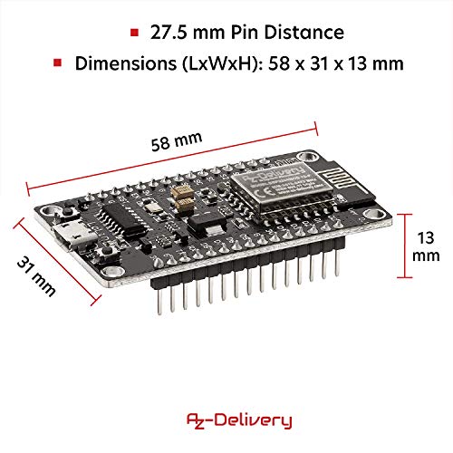 - ✅ Gran espacio de almacenamiento y procesamiento: AZ-Delivery ESP8266 con wifi cuenta con gran espacio de almacenamiento y procesamiento a bordo que le permiten integrarse con sensores y dispositivos específicos de la aplicación y soportar una carga mínima durante el tiempo de ejecución. Potencie su desarrollo de la manera más rápida combinando con el Firmware de NodeMcu!