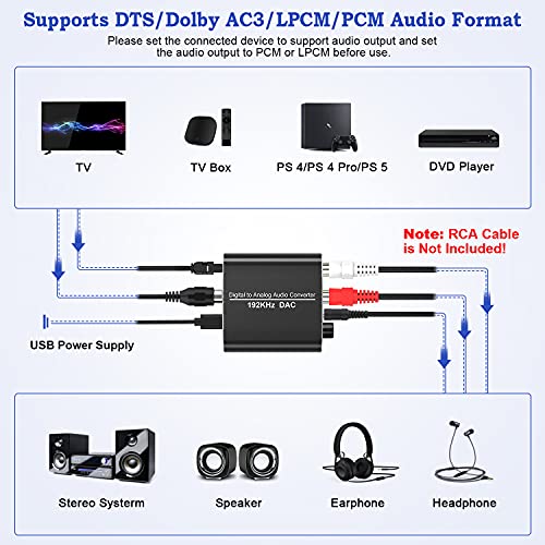 - 【Entrada y Salida Revestida en Oro】 Interfaz Chapada en Oro para Reducir la Pérdida de Transmisión de Señal. Conector de Entrada Chapado en Oro: 1 x Toslink (Incluidos 1M 4.0 / OD Toslink Cable), 1 x RCA (Coaxial); Salida Chapada en Oro: 2 x RCA (R / L), 1 x Jack de 3,5 mm; Alimentado por un cable USB de 5.5 mm (el Adaptador de Corriente NO Está Incluido); Solo Puede Usar un Enchufe de 5V 1A