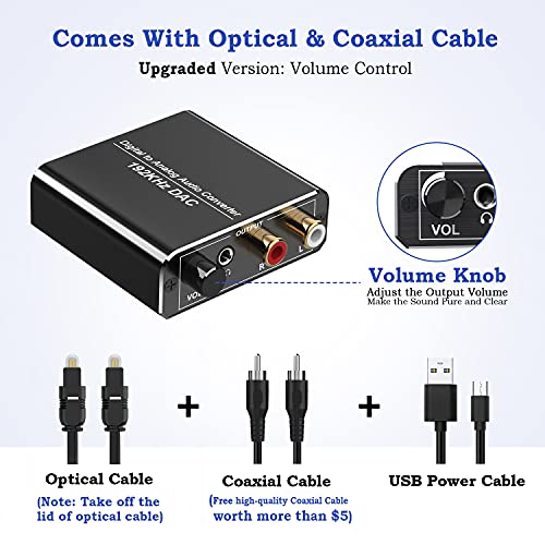 Convertidor Digital a Analógico con Volumen Ajustable 192kHz DAC Audio Óptico Coaxial Toslink a Analógico Estéreo L/R y Jack 3.5mm con Cable Óptico para PS3 PS4 Xbox HDTV, DVD