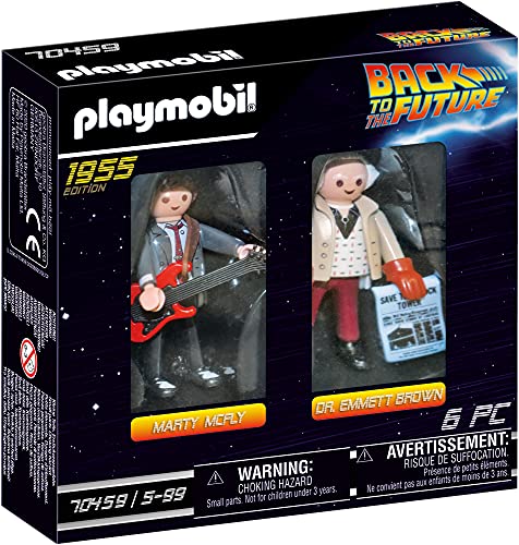 - Contenido: 1 PLAYMOBIL Back to the Future Marty Mcfly y Dr; emmett Brown, Juego de 6 piezas con instrucciones: 2 figuras, 4 accesorios, Material: Plástico, Se puede montar individualmente, Peso: 30 g, 70459