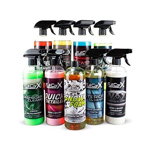 - El kit contiene: 1 CERA LÍQUIDA CARNAUBA FullCarX 750 ml, 1 LIMPIA CRISTALES FullCarX 750 ml, 1 LIMPIA LLANTAS FullCarX 750 ml, 1 CHAMPÚ ACTIVO FullCarX 750 ml, 1 LIMPIA SALPICADEROS FullCarX 750 ml, 1 RECUPERADOR DE PLASTICOS FullCarX 750 ml, 1 LIMPIA TAPICERÍA TEXTIL