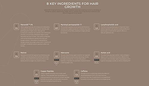 - TRATAMIENTO PARA EL VÉRTEX Y LA ZONA FRONTOPARIETAL: Los ingredientes activos favorecen el crecimiento en la zona frontoparietal del cabello y el vértex El ácido azelaico y la cafeína bloquean la DHT (Dihidrotestosterona) asociada con la alopecia androgenética, abren canales de iones en las células foliculares, estimulan la fase anágena (crecimiento) de los folículos pilosos y reducen la inflamación del cuero cabelludo.