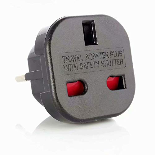 - Adaptador que permite usar los equipos eléctricos con sistema de conexión británico en países que usan tomas de corriente con sistema de conexión a tierra como DE, FR, BE, PL, NL, ES, PT, SE, FI, NO, GR, TR, AT ...